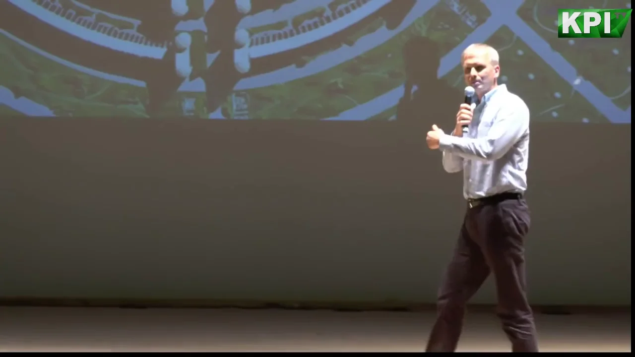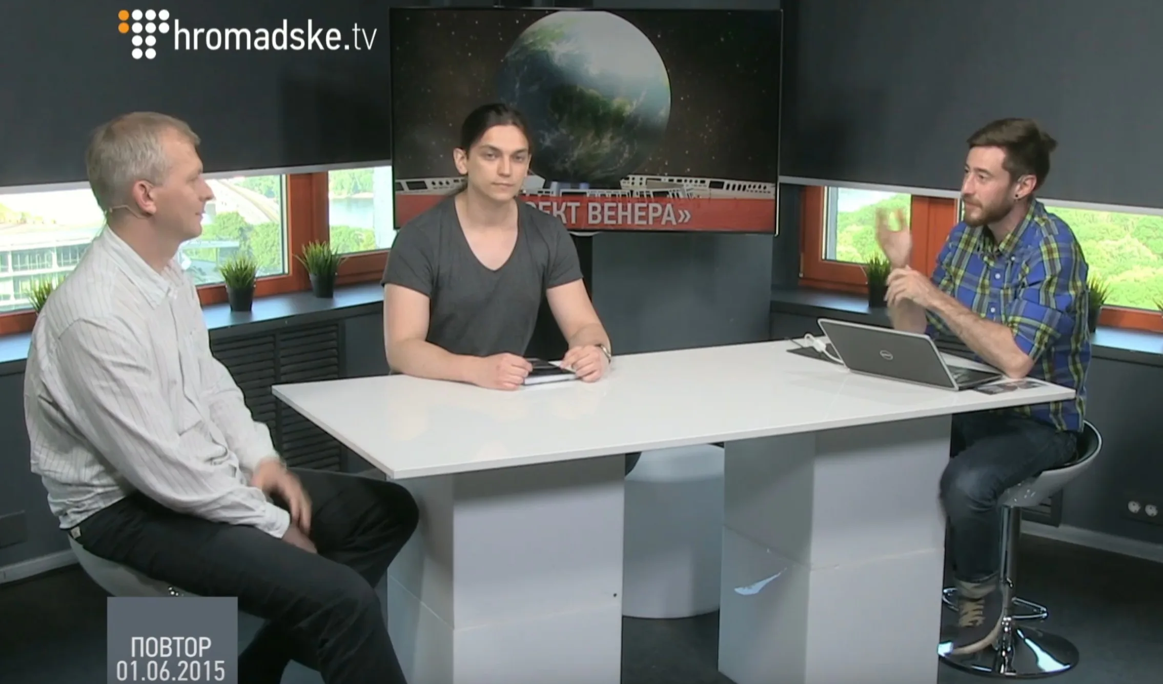 Андрій виступав у Київському Політехнічному Інституті – тоді мені з командою вдалося в рекордні строки зібрати 1700 глядачів на прем’єру фільму “Вибір за нами”, з прямим включенням з Жаком Фреско. Це було 2015 року. Також ми дали інтерв’ю разом із ним на Громадському (див. фото нижче).